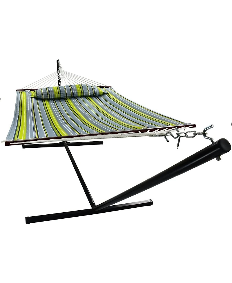 Enjoy a relaxing moment with the Sorbus Hammock Bed! This trendy hammock bed is great for two people and the perfect addition to your indoor/outdoor space. No more drilling hooks into the ceiling or searching for the perfect tree to hang your hammock! This quilted hammock bed features a spreader bar supported by sturdy ropes, on a freestanding frame. It adds style and comfort with a tasteful combination of vibrant stripes and a matching detachable pillow. Spend the day reading on the deck, relaxing by the pool, or nestling into a cozy "cocoon" with someone special. When you're ready to re-locate, detach the hammock from the frame and transport it to your next location. Great for any season, this hammock is a beautiful accent to your patio, yard, or garden.