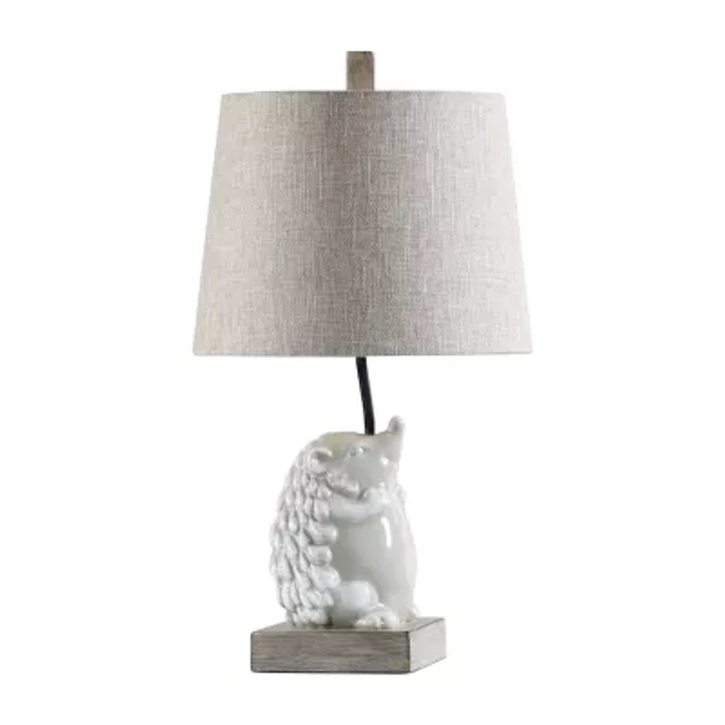 An adorable option for a childs room or nursery, this table lamp features a little hedgehog as the lamp base with a tan shade. Complete with a contrasting base, this charming table lamp is sure to make a statement. Place it on any tabletop or desk to add some cuteness.