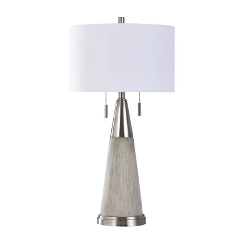 Ready to shine in a contemporary living room or family room, the Cigala table lamp has a white shade and a gray faux wood frame on a polished steel base. There are several additional polished steel accents: the lamp's neck, dual pull strings, and the finial. The wide drum shade sets off the tapered shape of the body, and the gray and white tones of the faux wood finish complement the silver polished nickel.