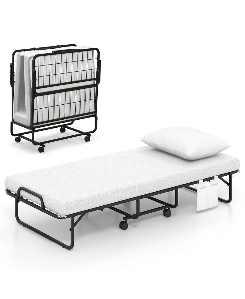 Experience ultimate comfort with our folding bed, featuring a plush memory foam mattress and soft pillow for a restful sleep. Its robust all-metal frame supports up to 480 lbs. Effortlessly fold and store with a dust cover and secure strap. Smooth mobility is ensured with universal wheels, while a handy pocket keeps essentials close.