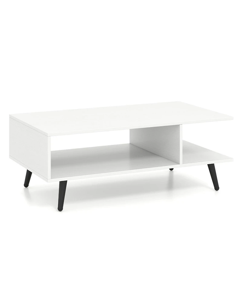 Designed to maximize organization and daily function, this coffee table provides 2 tier storage to keep your living space tidy and clean. Its spacious tabletop is ideal for displaying decor, dining, or working, while two open compartments hold drinks, books, and tissue boxes. Tapered metal legs offer reliable support, and non slip foot pads protect floors. With ample clearance for easy cleaning and a mid century modern style that blends with various settings, this table combines practicality with timeless design. Assembly is needed