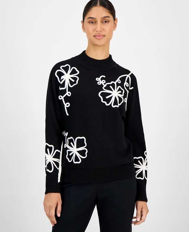 T Tahari Women's Mock Neck Floral Embroidered Sweater