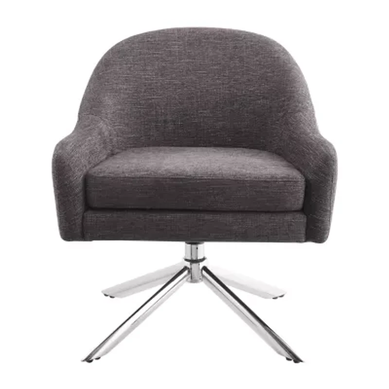 Effortless in its elegant presentation and ergonomic support, this chair serves as the perfect midcentury accent piece. The padded frame is upholstered in grey fabric, featuring an understated bucket shape with low profile arms. The metal x base in chrome swivels 360 degrees so you can quickly turn from one conversation to the next. Place it in your living room, bedroom, home office or den for a relaxing yet refined perch.