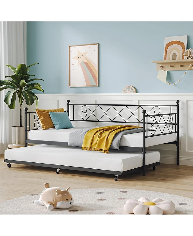 gaomon Twin Daybed with Trundle, Metal Twin Size Daybed with Pullout Trundle 6 Casters, Steel Slat Support Sofa Bed for Living Room, Bedroom, Guest Ro