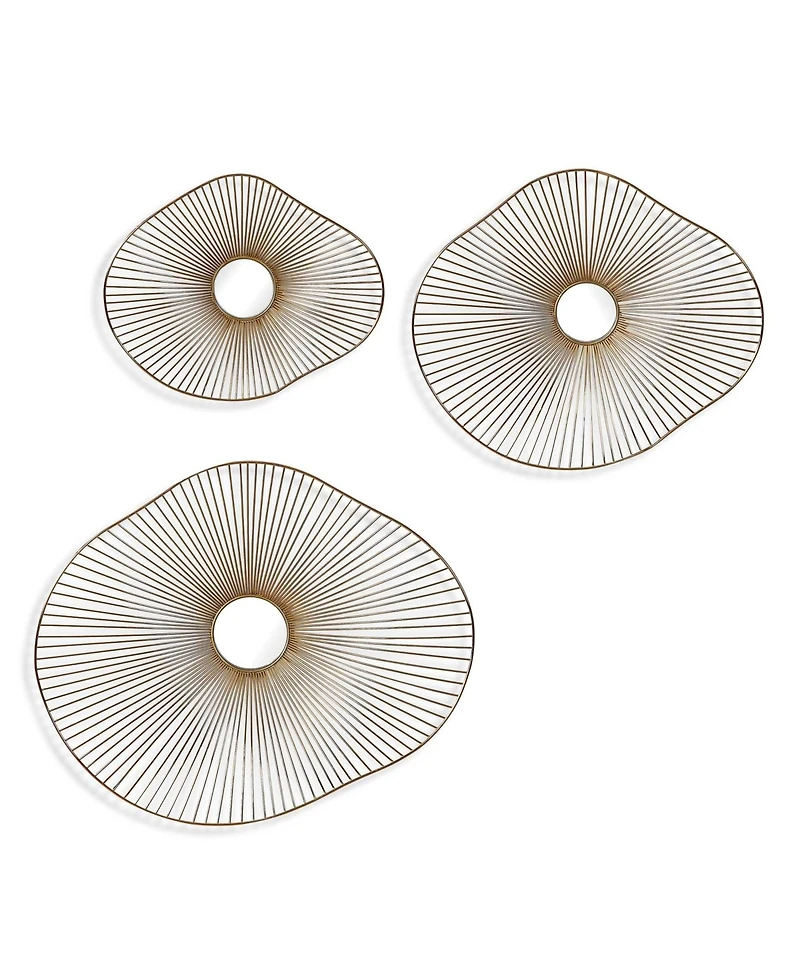 This contemporary set of three metal wall decor features 3-dimensional organically curved shapes with radiating metal spokes, finished in a plated gold with mirrored center accents.