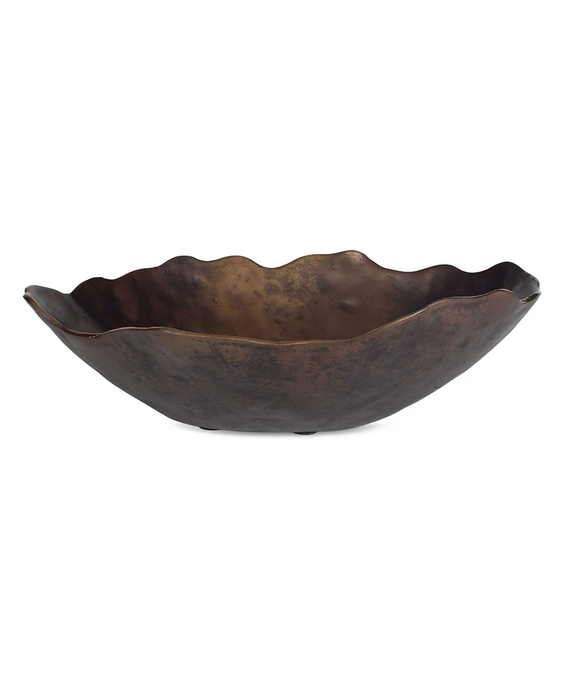 Elevate your decor with this stunning sculptured cast aluminum bowl, featuring a wavy edge and a rich, golden dark bronze finish and hammered texture. Its handcrafted texture adds depth and elegance to any space. May be hung on wall or used as tabletop accessory. Safe for outdoor use.