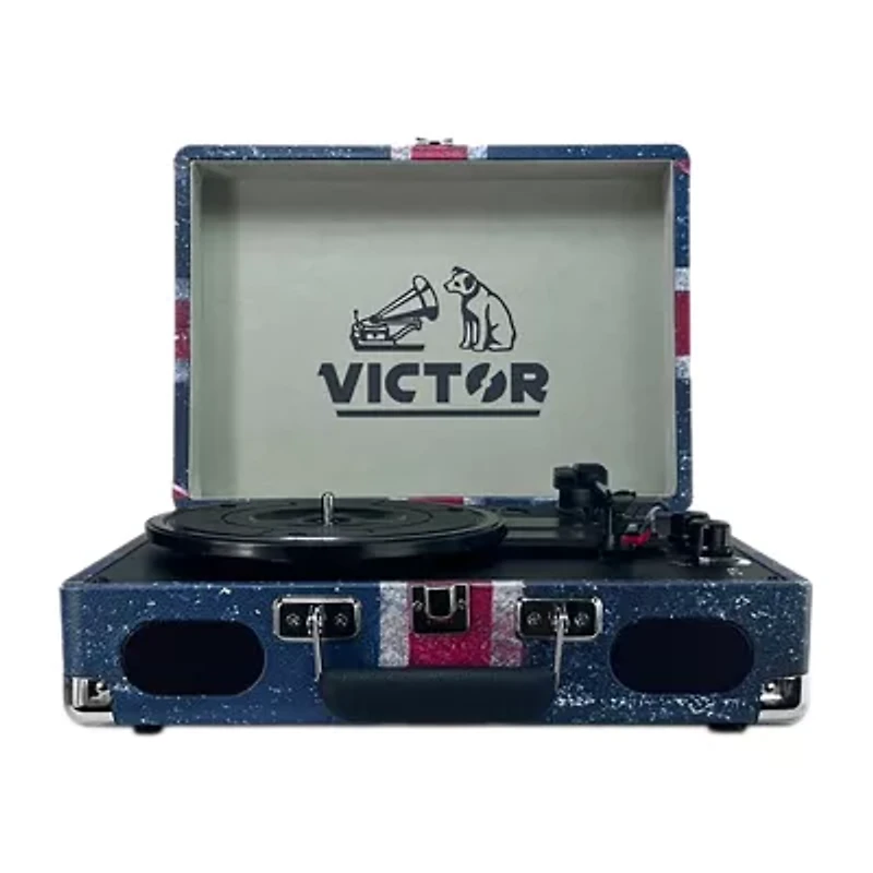 The Victor Metro Plus VSRP-850B is the perfect blend of vintage and modern with our 3-Speed Turntable. It plays 33 1/3, 45, and 78 RPM records, including a 45 RPM adaptor, and lets you stream music from your phone up to 33 feet away using Bluetooth IN. A built-in rechargeable battery powers built-in stereo speakers for seamless playback-perfect for impromptu listening anywhere. The retro suitcase design, complete with a secure latch, corner guards, auto-stop control, volume knob, headphone jack, and line-out, makes it as practical as it is eye-catching