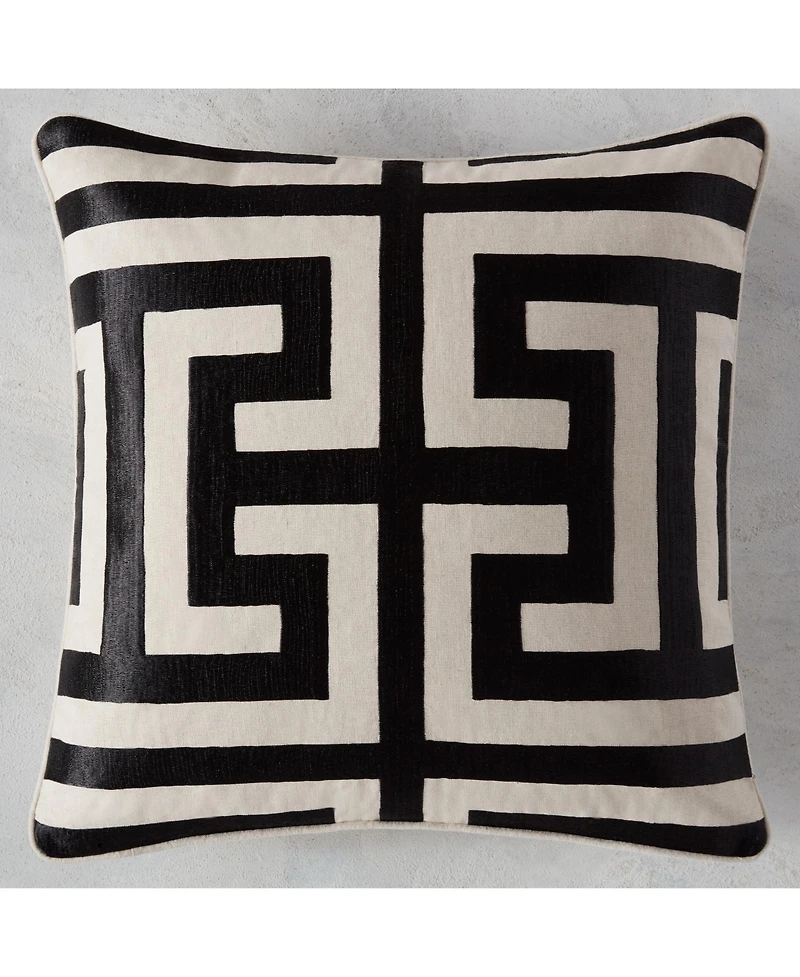 Elevate your sofa, bed or seating area with this elegantly designed pillow, a refined accent that blends timeless pattern and modern luxury. It is crafted from a premium cotton-and-linen-blend fabric, offering a breathable, textured base that balances casual comfort with sophisticated style. The front showcases a lustrous metallic Greek key embroidery that adds subtle shimmer and classic architectural detail, while the solid-color reverse and clean piping deliver a polished, finished look. Filled with a plush feather-and-down insert, it provides resilient, long-lasting comfort ideal for lounging and daily use. Versatile enough for classic, modern and transitional interiors, this pillow merges durable fabric, eye-catching metallic detailing, tailored finishing and cloud-like comfort into one sophisticated home accent.