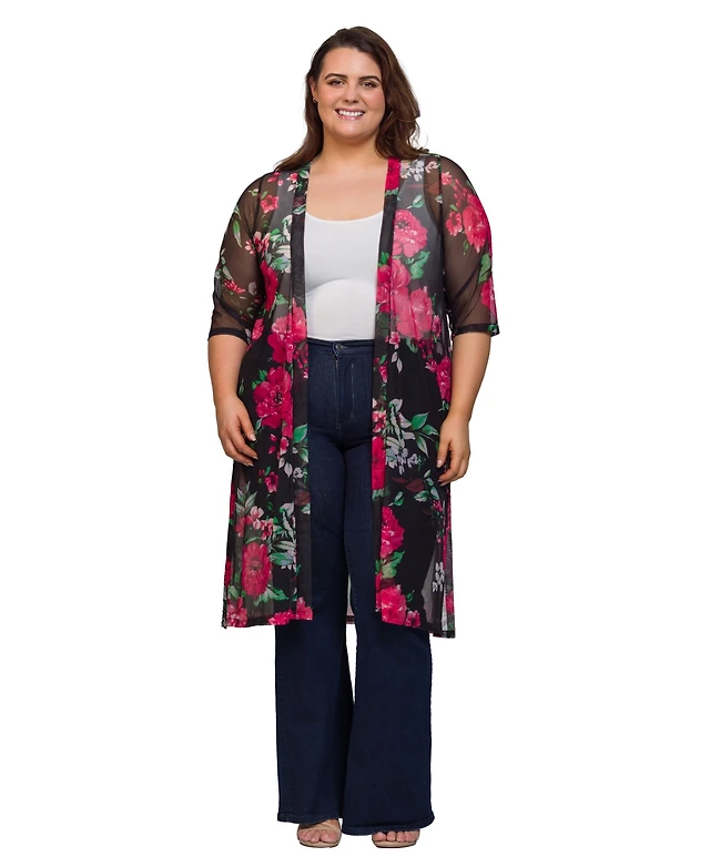 24seven Comfort Apparel Plus Sheer Floral Knee Length Duster Cardigan Sweater