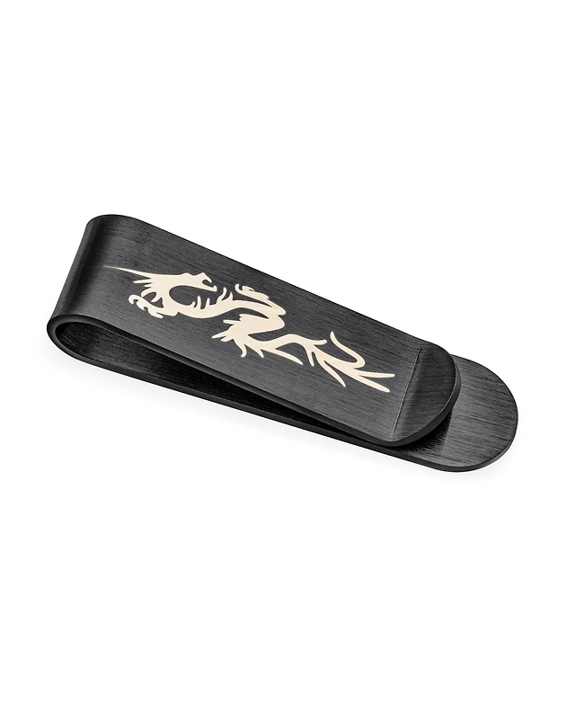 Bling Jewelry Two Tone Asian Style Black Grey Slender Strong Dragon Money Clip Card Holder Gift Father Laser Etched Black Ip Stainless Steel
