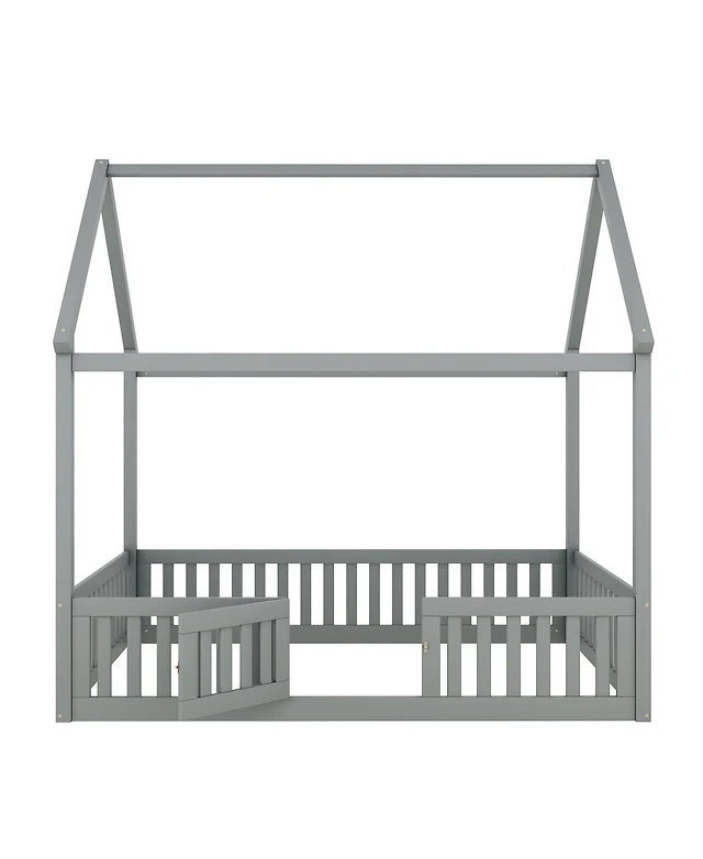 Boyel Living Full Size Wood House Bed with Fence and Door
