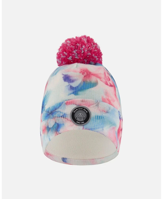 Deux par Girl Lined Knit Pompom Hat Blue Flower Print - Toddler|Child