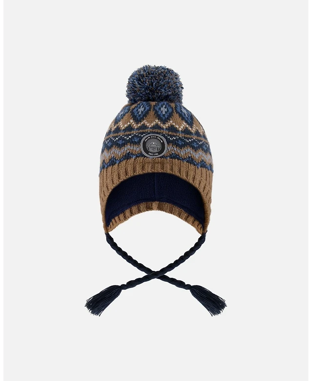 Deux par Deux Boy Lined Knit Pompom Hat Taupe and Navy - Toddler|Child