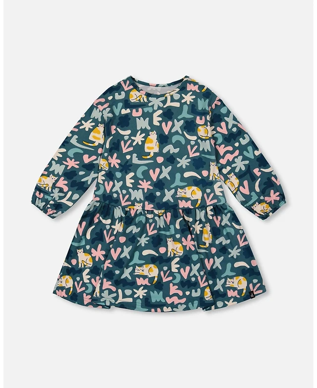 Deux par Girl Half Button Cotton Dress Blue Llama Print - Child