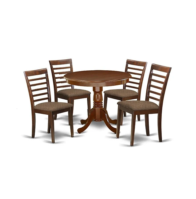 East West Furniture 5 Piece Dining Room Table Set - Mahogany Modern Dining Table with 4 Mahogany Linen Fabric Kitchen Chairs with Slatted Back