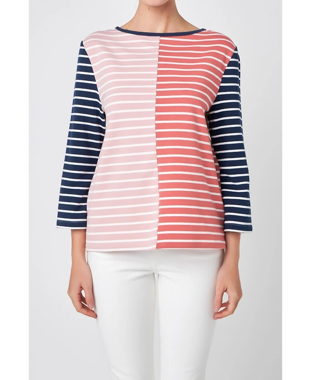 English Factory Women's Striped Color Blocked 3/4 Length Sleeve Tee