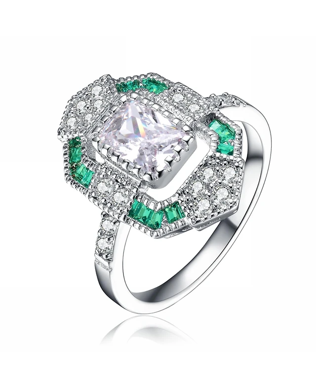 Sterling Silver with Rhodium Plated Green Cubic Zirconia Ring