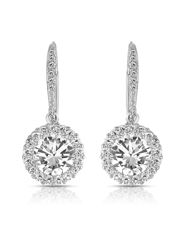 Sterling Silver with White Gold Plated Clear Round Cubic Zirconia Haloed Solitaire Drop Earrings