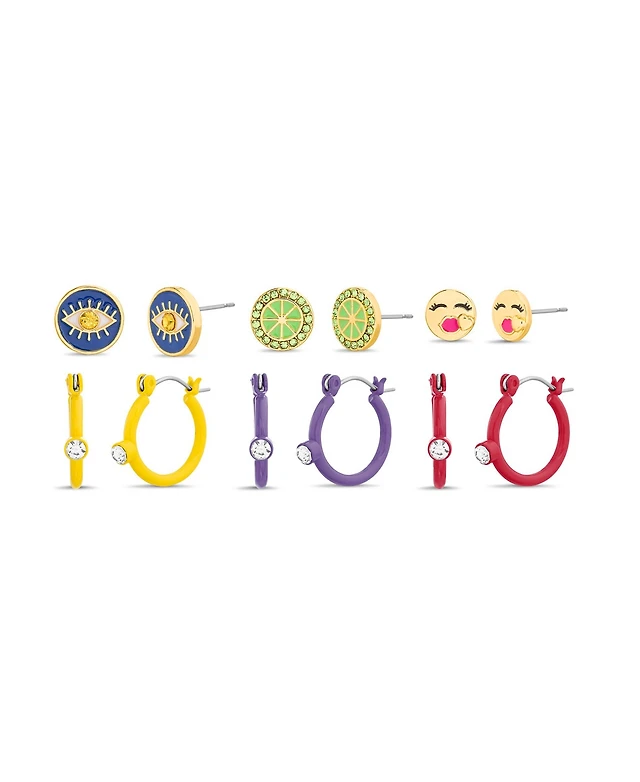 kensie 6 Piece Mixed Cubic Zirconia Evil Eye, Lime and Kiss Emoji Stud and Hoop Earring Set