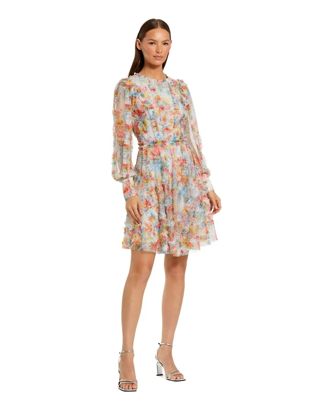 Mac Duggal Women's Floral Mesh Ruffle High Neck Mini Dress