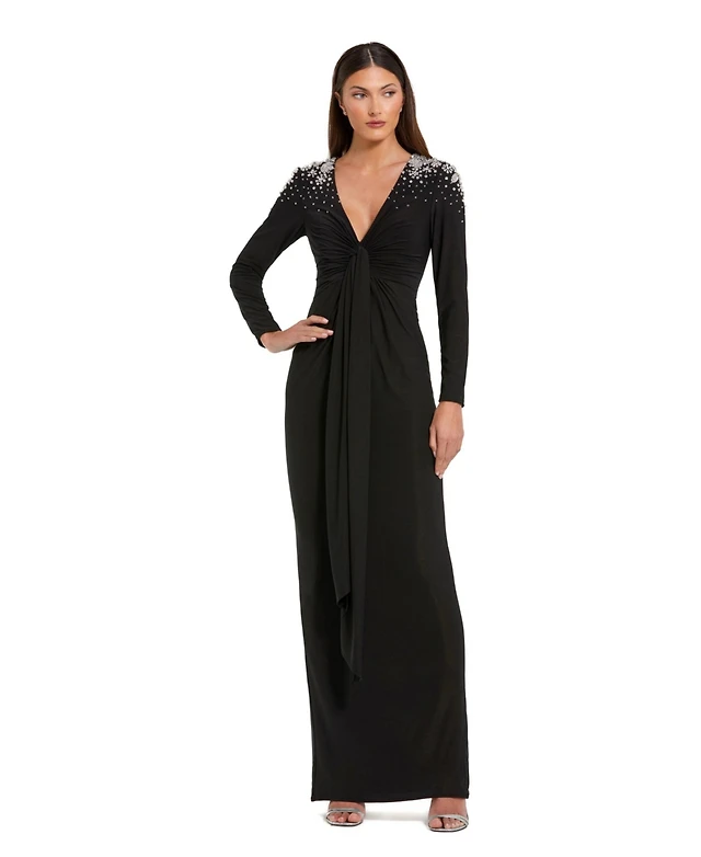 Mac Duggal Women's Jersey V Neck Faux Knot Gown With Beaded Shoulders