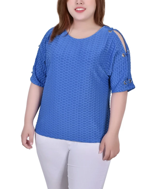 Ny Collection Plus Size 3/4 Roll Tab Zip Front Jacquard Knit Top