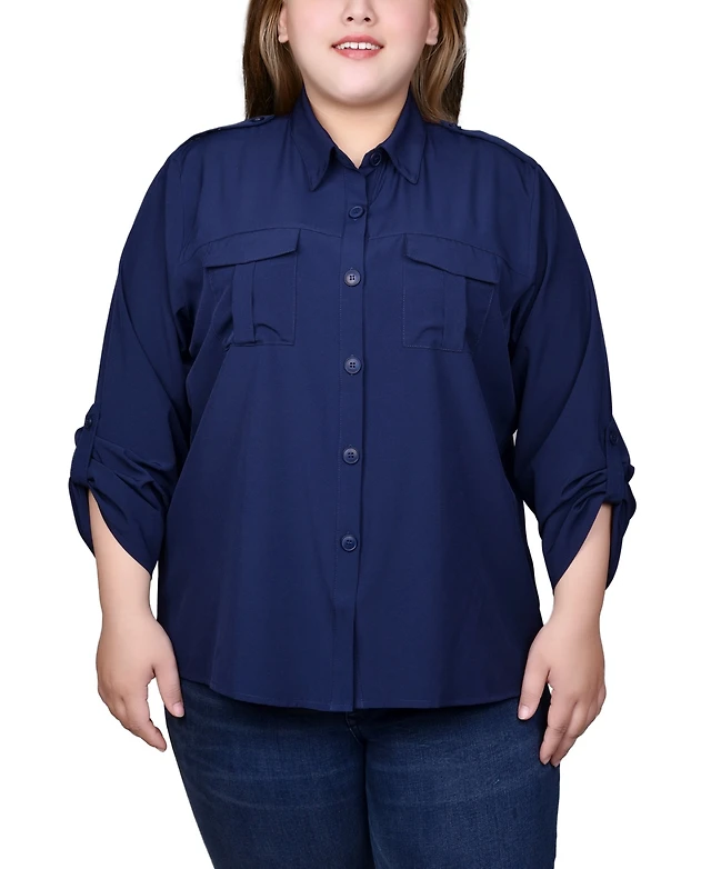 Ny Collection Women's Short Rolled Sleeve Button Front Blouse