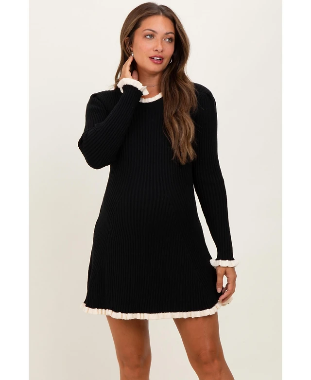 Pinkblush Maternity Black Ribbed Knit Contrast Ruffle Trim Mini Dress