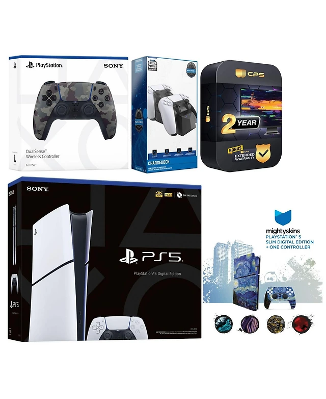 Sony PlayStation 5 Slim Digital PS5 with Extra Chroma Indigo Controller, Dual Charging Dock and MightySkins Voucher Bundle