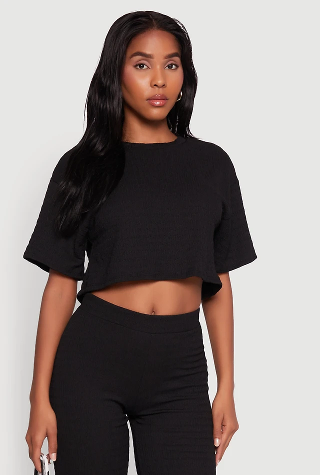 Textured Knit Solid Long Sleeve Crop Top