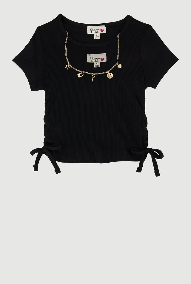Girls Ribbed Knit Side Ruched T-Shirt with Charm Necklace