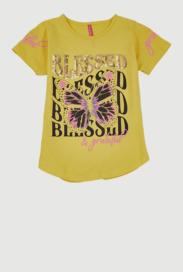 Girls Sequin Blessed And Grateful Butterfly Tee