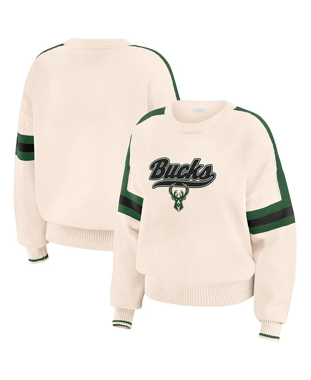 Wear by Erin Andrews Women's Cream Milwaukee Bucks Stripe Pullover Sweater