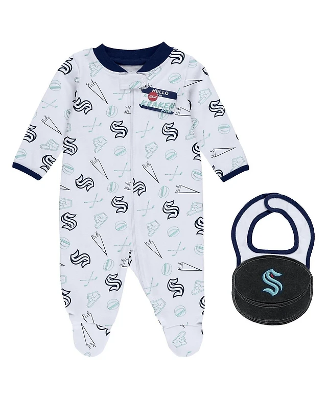 Baby Boys and Girls Wear by Erin Andrews White Seattle Kraken Sleep Play Full-Zip Footed Jumper with Bib