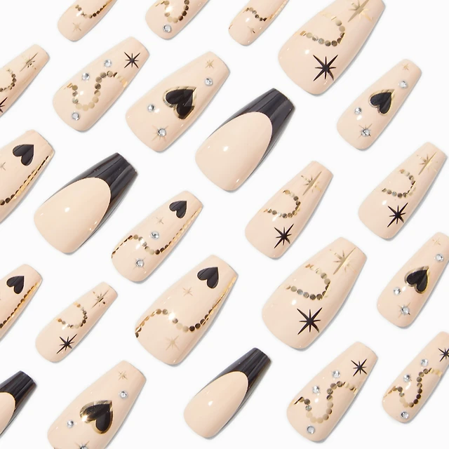 Black Heart Bling French Tip Squareletto Vegan Faux Nail Set - 24 Pack