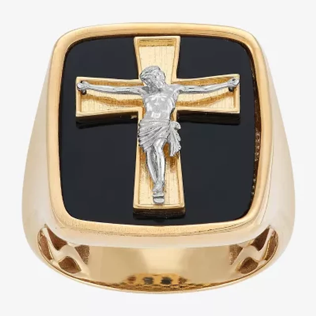 Crucifix Mens Genuine Black Onyx 10K Gold Cross Signet Ring