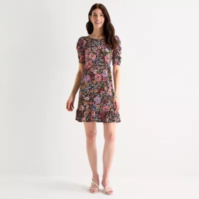 Perceptions Womens Petite Short Sleeve Floral Fit + Flare Dress