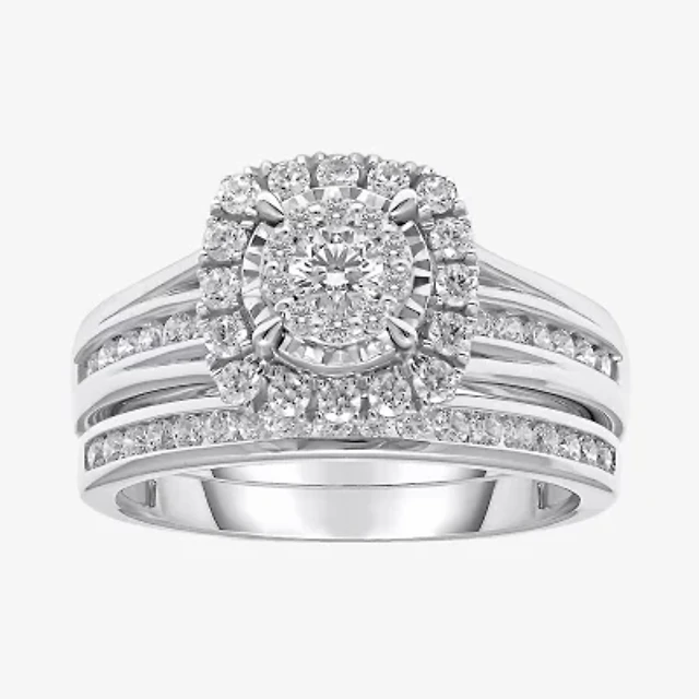 (I / SI2) Womens 1 CT. T.W. Lab Grown White Diamond 10K or 14K Gold Cushion Side Stone Halo Bridal Set