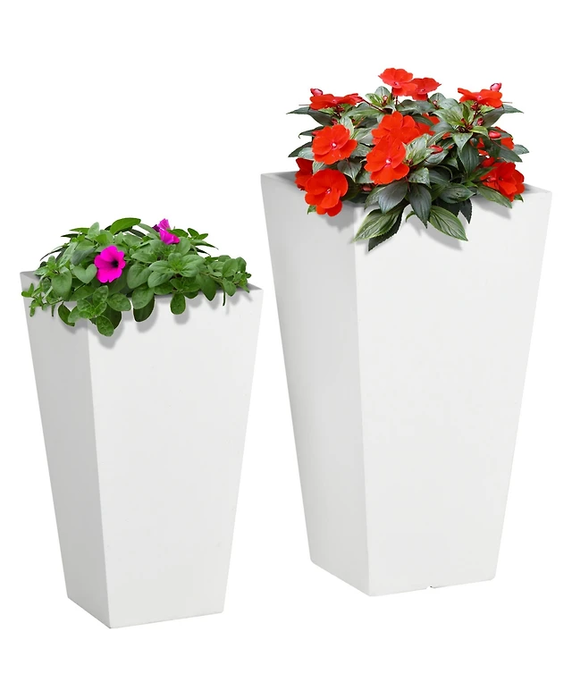 Casafield (Set of 2) All-Weather Outdoor Planters with Liners - White, Tall Tapered Plant Boxes with Flower Pots for Front Porch, Patio, Garden