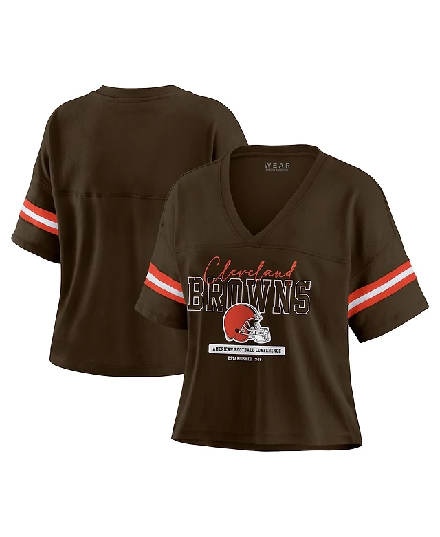 Wear by Erin Andrews Women's Brown Cleveland Browns Color Block Boxy Modest Crop V-Neck T-Shirt