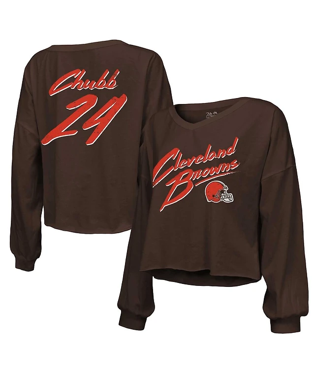 Women's Majestic Threads Nick Chubb Brown Distressed Cleveland Browns Name and Number Off-Shoulder Script Cropped Long Sleeve V-Neck T-shirt