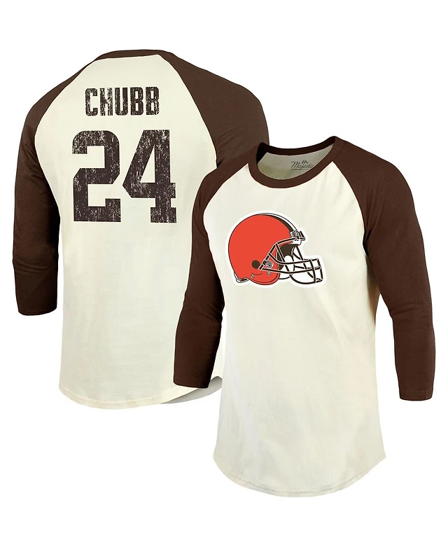 Men's Majestic Threads Nick Chubb Cream, Brown Cleveland Browns Player Name and Number Raglan 3/4-Sleeve T-shirt