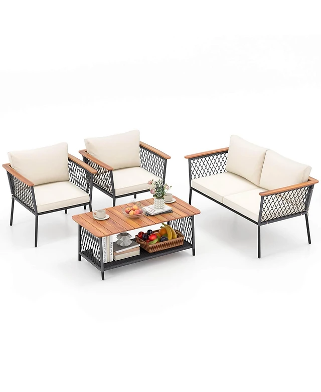 Gymax Set Of 4 Patio Conversation Set w/ Coffee Table Solid Acacia Wood Armrests Tabletop