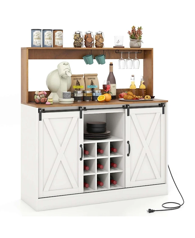 Farmhouse Coffee Bar Cabinet with Charging Station and Sliding Barn Doors