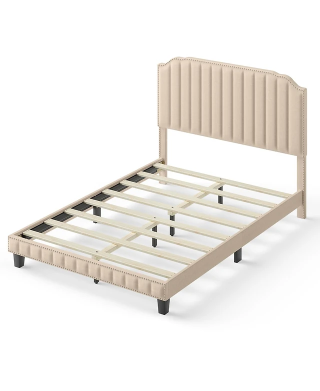 Gymax Queen Upholstered Bed Frame with linen fabric vertical lines Rivets headboard