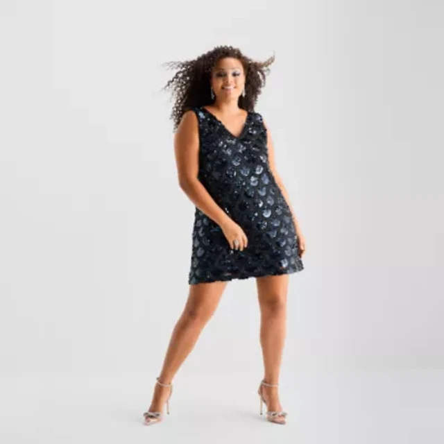 Bob Mackie Womens Plus Sleeveless Sequin A-Line Dress