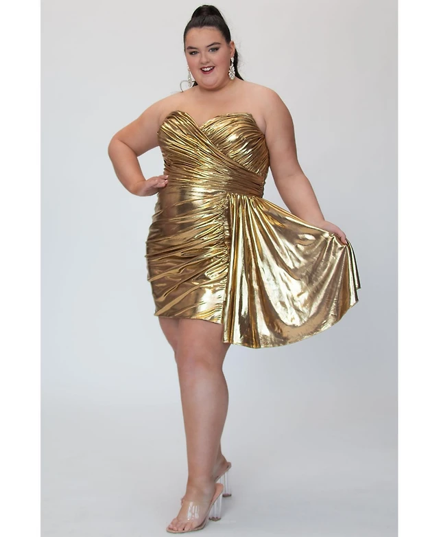 Sydney's Closet Women's Metallic Gold Strapless Short Party Dress with Drape Flyaway