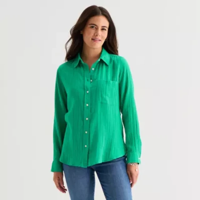 Gloria Vanderbilt Womens Roll Tab Long Sleeve Loose Fit Button-Down Shirt