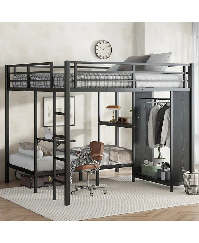 Simplie Fun Wood Full Size Loft Bed with Built-in Wardrobe, Desk, Storage Shelves and Drawers, Grey