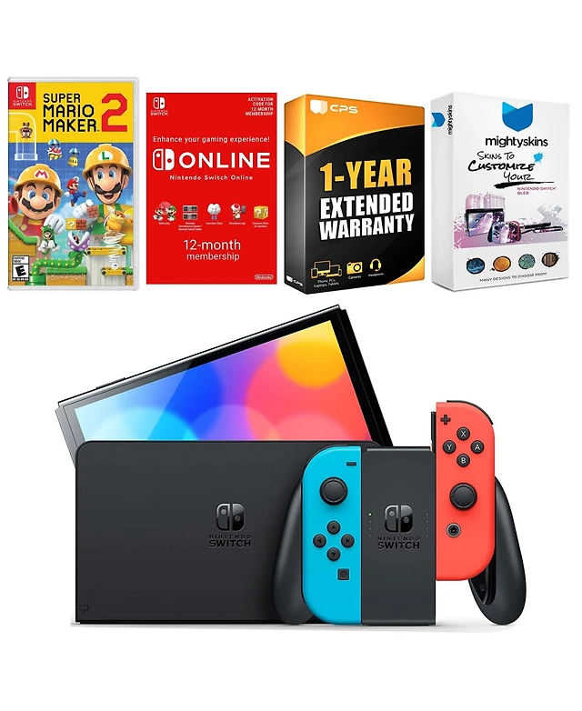 Nintendo Switch Neon Red & Blue Oled Console with MightySkins and Controller Skin Voucher Year Cps Extended Warranty